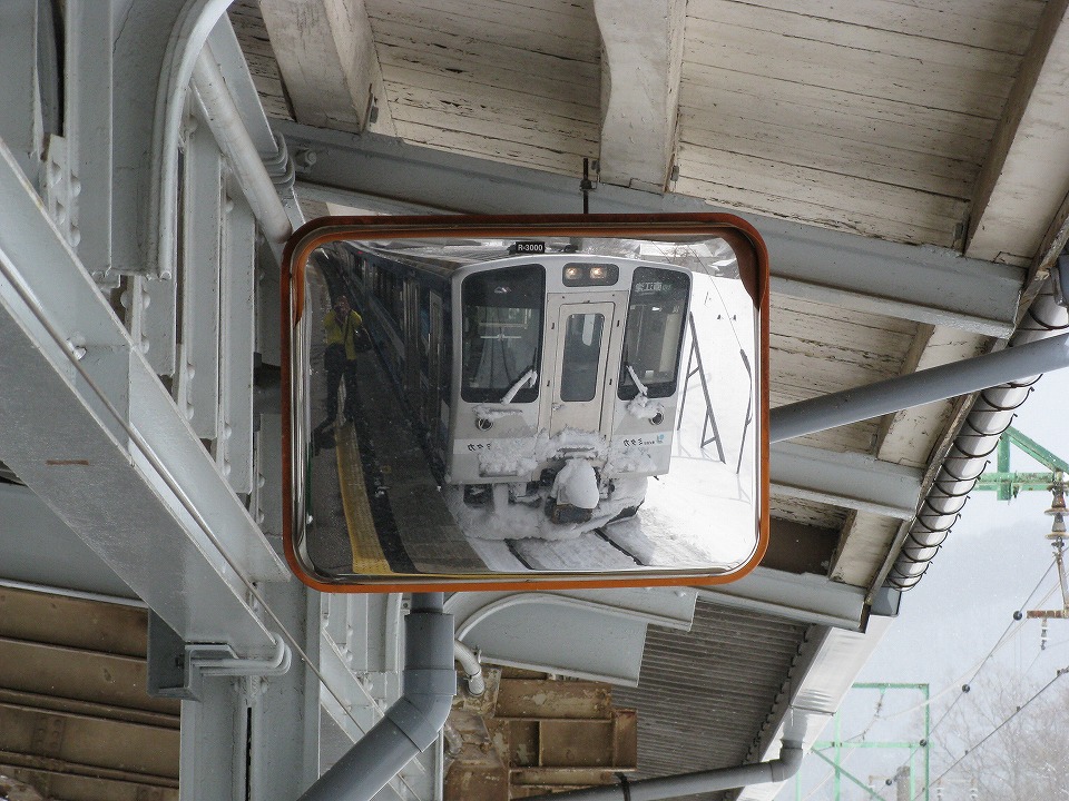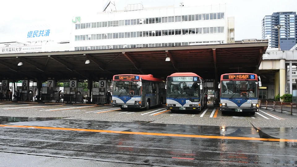 | 【おまけ】 スイッチバックの動画はYouTubeにたくさん転がっているのでそっちに任せるとして、 俺は同時発車の様子をUPしますね。 あるダイヤ改正で、3つ並んだホームの発車時刻が同じときがあった。 それで、新潟に帰ったときや出張で新潟に来たときに、 同時発車のシーンを撮影しようとかなり頑張って何回もチャレンジしたのだが、これがなかなかうまくいかなかった。 発車時刻は数字上は同じでも、ほんのちょっとのタイミングの違いで「本当に同時の発車」にはならないことがほとんどなんだよね。 ところが! やっとやっと撮影できたときがあったんだね。これは嬉しかったよ! 2017/09/30の、約24秒の動画はこちら。 なお、バスが左ウインカーを点けながら右に向けて発車しているのは、この後すぐに左折するからであり、ここでの「お約束」なのだよ。 ちなみに、この発車パターンは次のダイヤ改正(確か)でなくなりました。 |