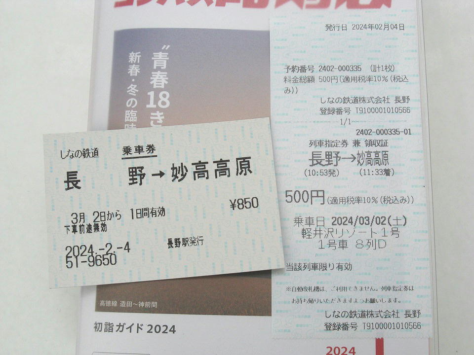 | 初っぱなは、しなの鉄道の「軽井沢リゾート1号」だ。 この列車に乗りたかったということではなく、上越妙高からの特急に乗るために「逆引き」 したところ、この列車が都合がよかった、というもの。 それにしても、指定券(右)が"レシート"なのが、テツとしては残念。 そのままではくるんと丸まっちゃうので、コンパス時刻表にかけているカバーに挟んで撮影した。 |