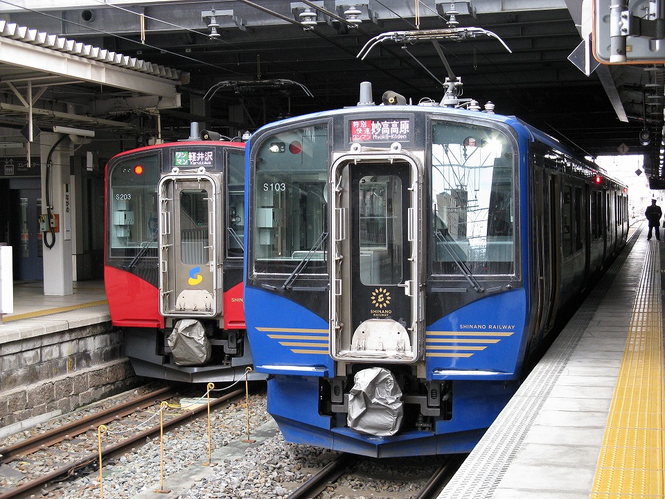 | 特別快速「軽井沢リゾート1号」(右)がやって来た。 車両のベースはJR東日本のE129系。 通勤型の車両がこうも変わるのかと思うほど、内外装をきれいに仕上げてある。 |