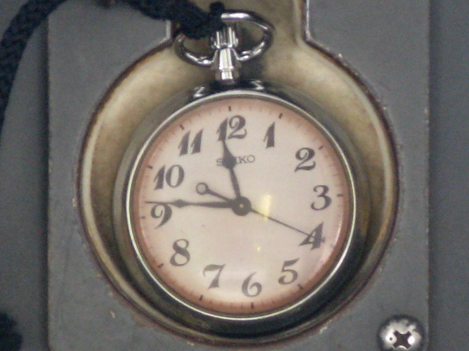 | 妙高高原からの電車の運転席にあった鉄道時計。 風防の周辺が赤味がかっているが、どう使ったらこのようになるんだろうね。 運転士さんに取材するようなことはしなかった。 この写真は旧いコンデジでただ撮っただけの原版から この大きさに等倍でトリミングしたもののため、鮮明さに欠けています。 |