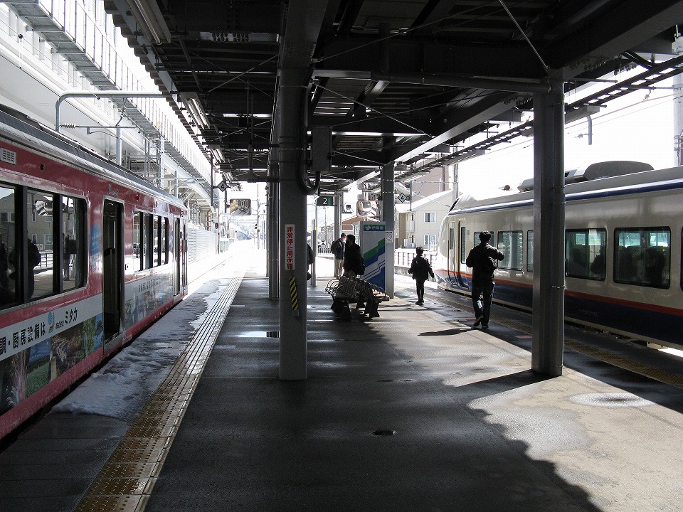 | スイッチバックの二本木駅には、上下線の列車が同時に到着した。 並走する様子をただ撮っただけの約1分の動画はこちら。 画角の両脇に客がいるので、カメラを左右に振ることができなかった。 |