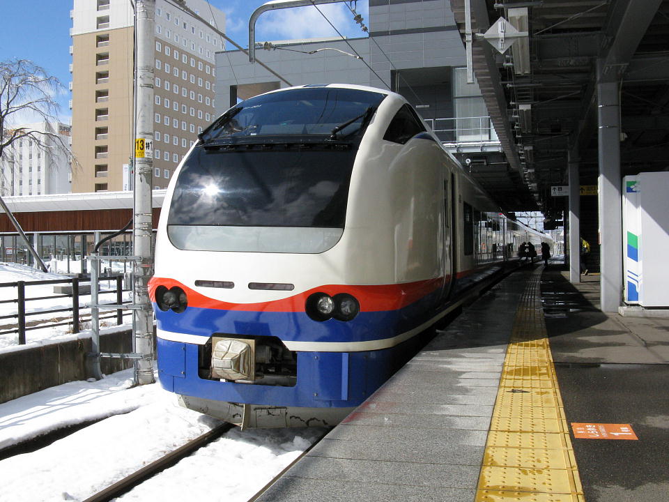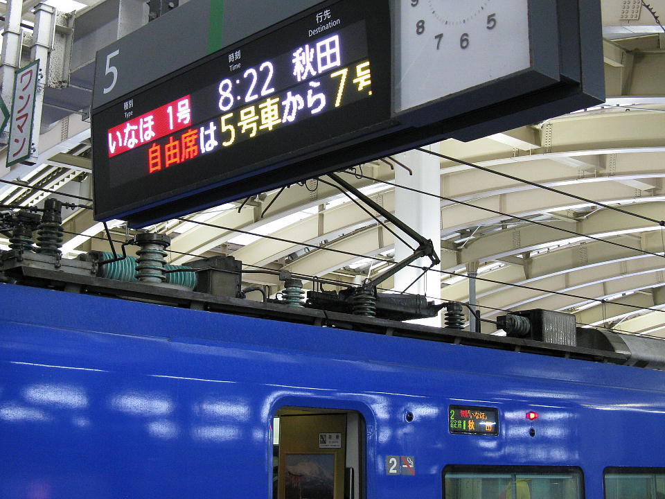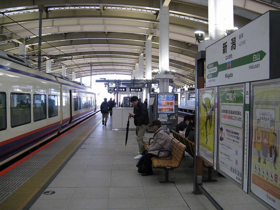 | 秋田行きの「いなほ1号」。 秋田まで行く「いなほ」は1日2本だけ。 発車時刻が近付いてきたら、どこからともなく駅員がたくさん集まってきた。拡声器を持っている駅員もいる。 「要人でもくるのか?」と思っていたら、上越新幹線の東京発の1番列車である「とき301号」が新潟到着した途端、 どどどどど~っと見るからにテツ系の連中が降りてきた。 拡声器では盛んに自由席への案内をしている。 そっか、コイツらも「キュン♡パス」なんだ! 俺は指定席を取ってあるから高みの見物だよ~(笑)。 |