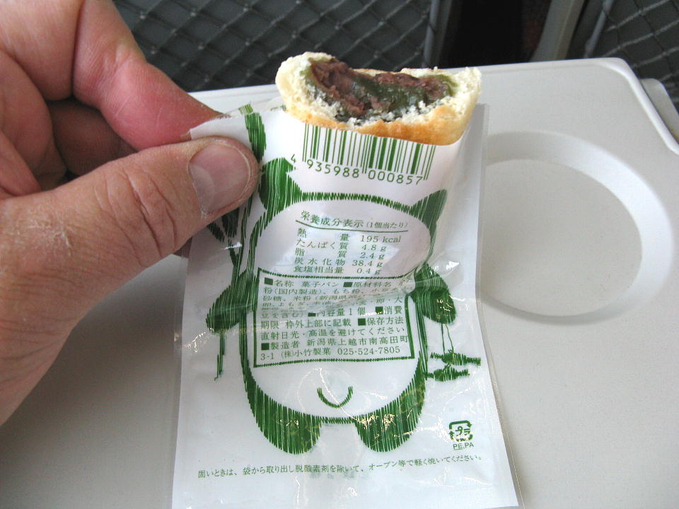 | 上越といえば、小竹のサンドパン216円ナリ。 上越妙高駅のキヨスクに山積みになっていたよ。 ついでに笹団子パン162円ナリ(右)もGET。 |