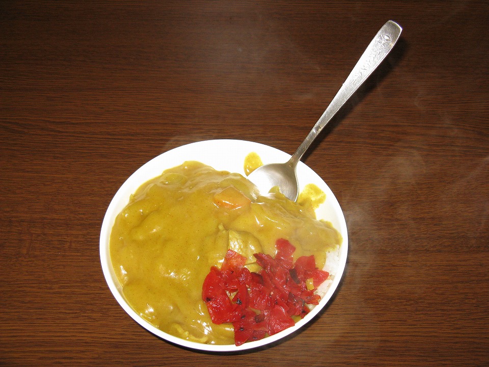 | 「バスセンターのカレー(ミニ)」420円ナリ。 昔懐かしい黄色いカレーなのだ。見た目の色よりも辛いゾ。 このカレーは、「ケンミンSHOW」でも取り上げられた。 |