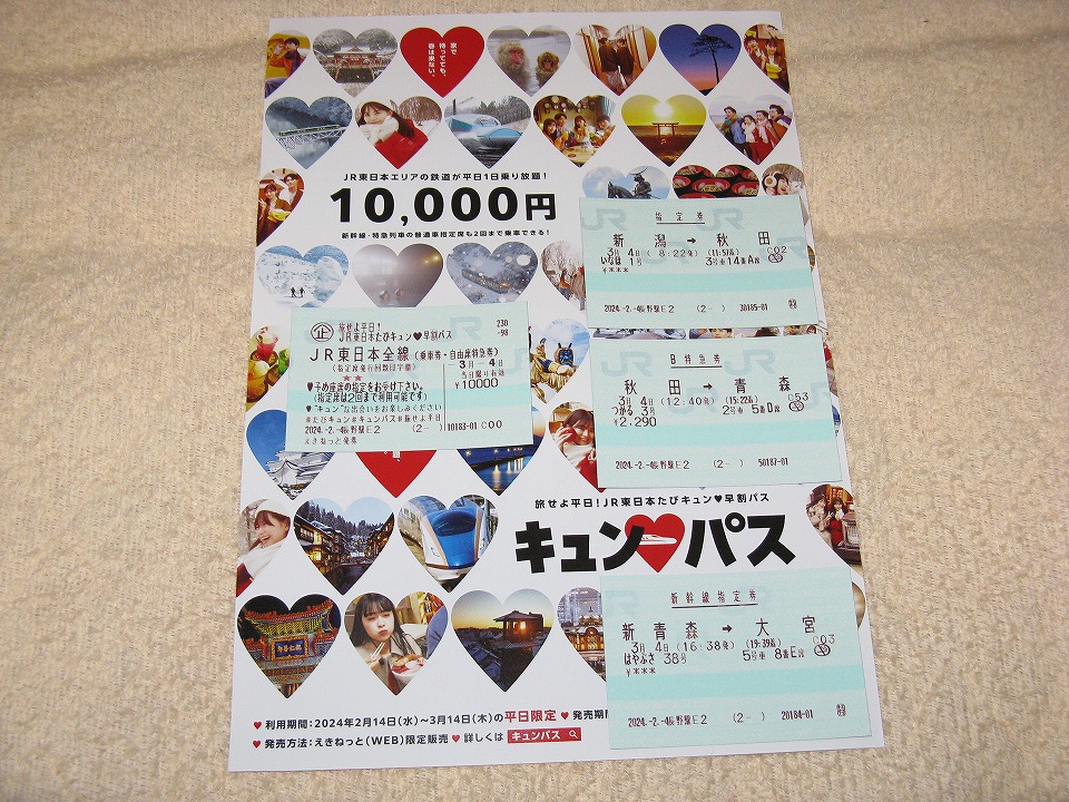 | 2024(令和06)年のバレンタインデーからホワイトデーまで、 JR東日本が「キュンパス」を発売した。 ごく簡単に書くと、平日にJR東日本が特急も含めて1日乗り放題で1万円というもの。 特急は、自由席なら回数制限がなく、指定席は2回まで乗れる。 コレを使わない手はない、と喜んで使ってみる。 |