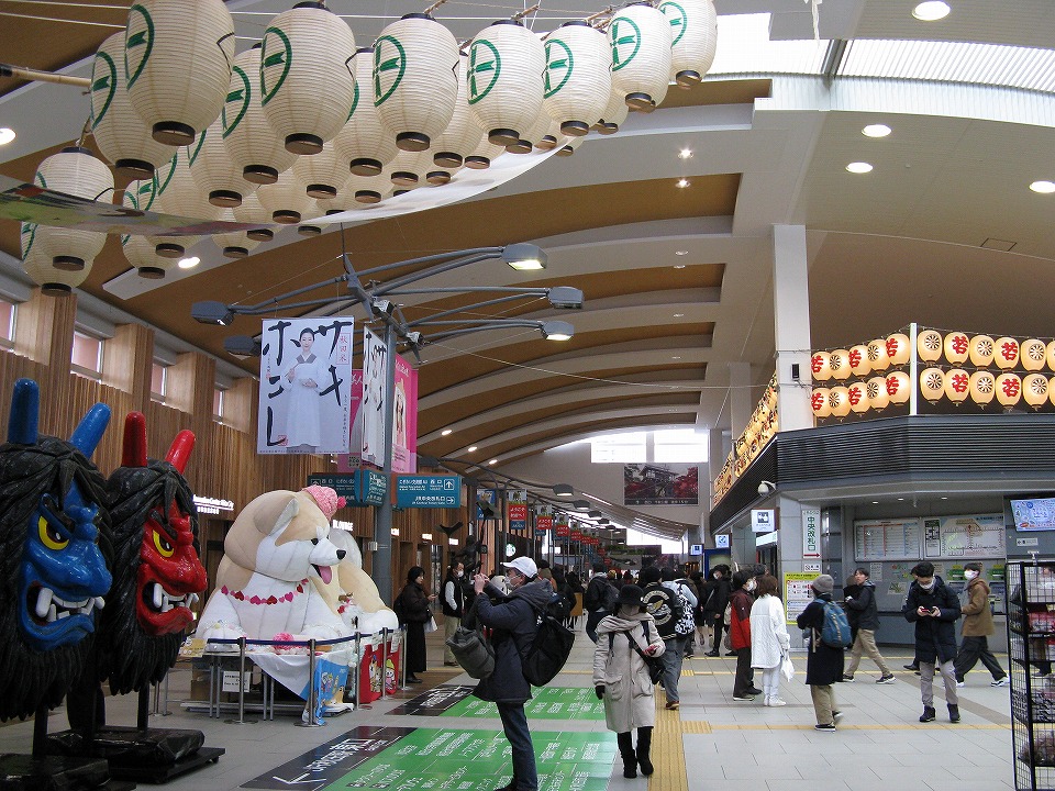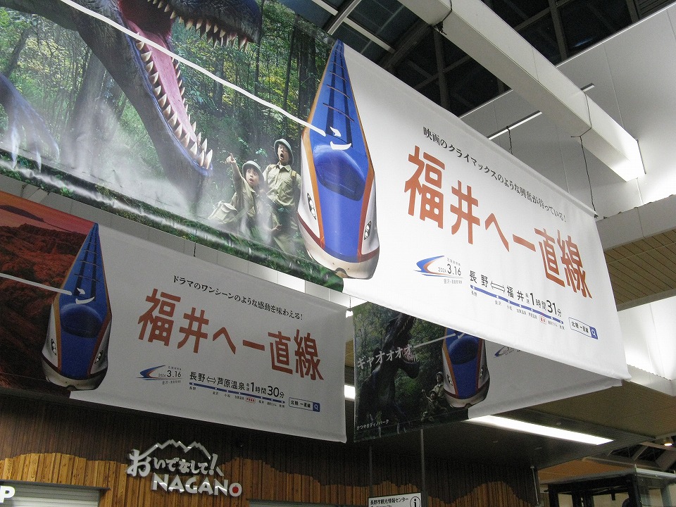 | 長野駅の改札を出たら、こんなのがぶら下がっていた。 北陸新幹線の敦賀開業まであと10日ほどだね。 山陰と絡めて乗りに行くよ。その様子はこちら(まだです。)。 |