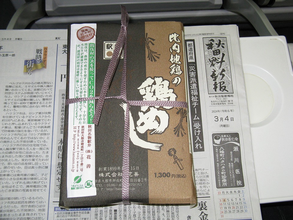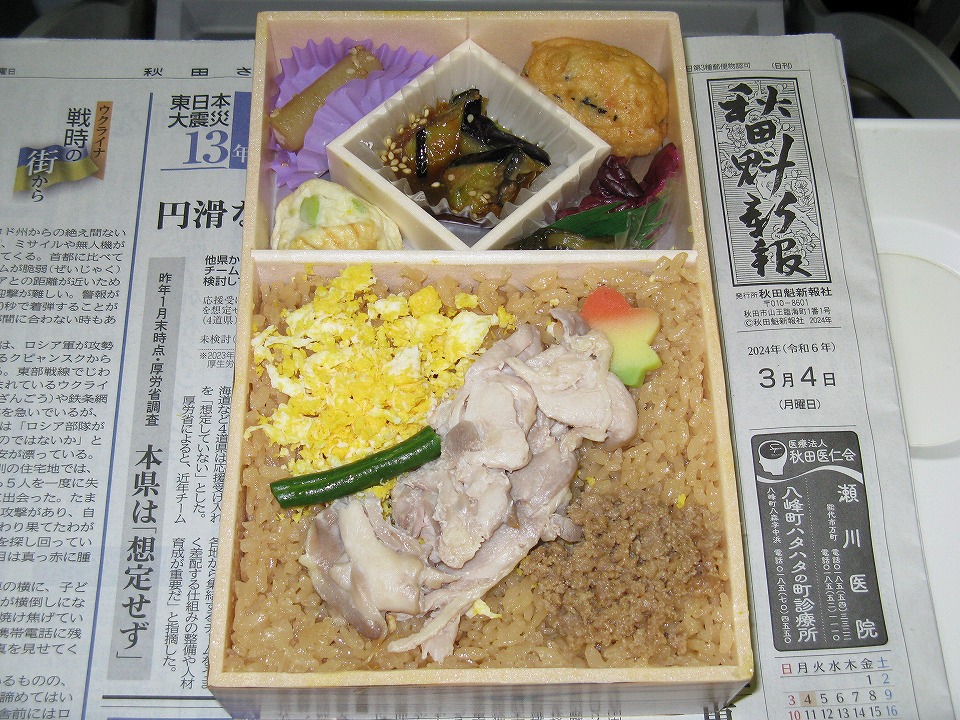 | 秋田駅でGETした「比内地鶏の鶏めし」1,300円ナリ。 フツーの「鶏めし」もあったが、ちょっとフンパツした。 掛け紙はもちろんお持ち帰り。 |