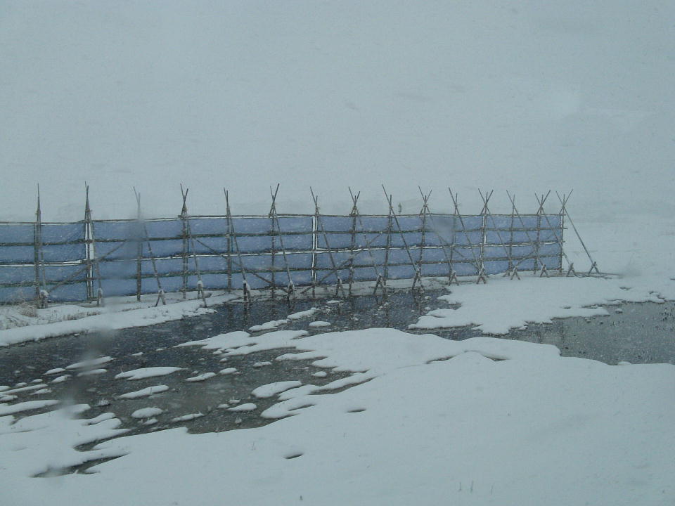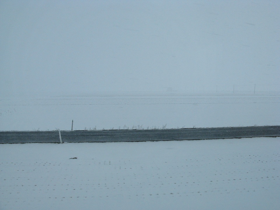 | 八郎潟付近の雪原。ずっと雪が降っている。 「鶏めし」をのんびり食しながら旅を続けている。 |