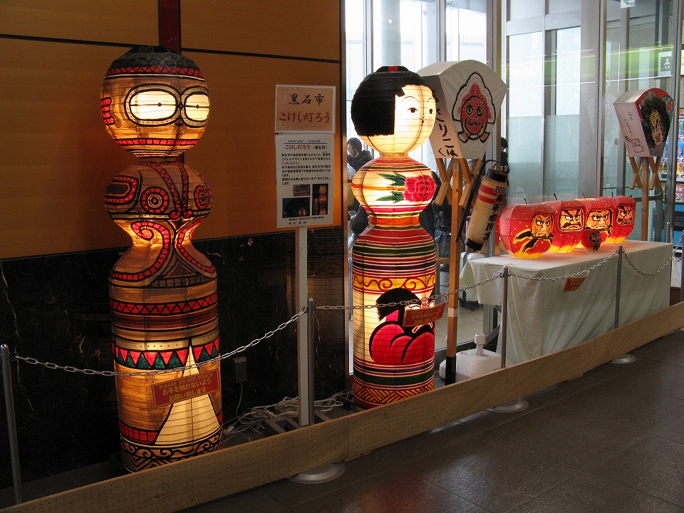 | 左の土偶のねぶたが何とも不気味(笑)。でもおもろいな。 内部照明が分かるように暗めに撮影した。 |