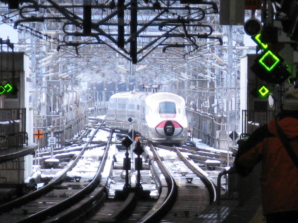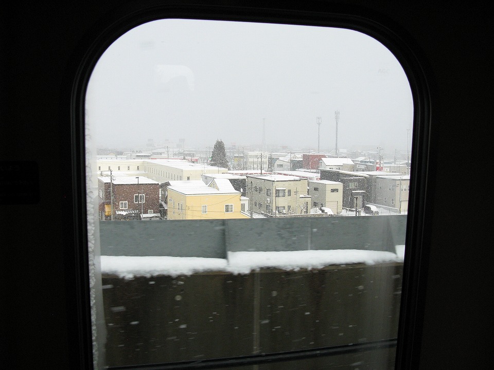 | 新青森が近付いてきている。 雪がかなり降っている。 |