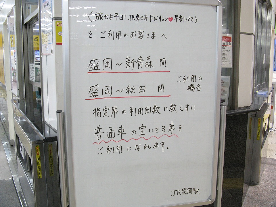 | 盛岡駅にあったホワイトボード。 「キュン♡パス」で新青森方面の「はやぶさ」や秋田方面の「こまち」に 指定券交付なしで乗れることを案内している。 「ご利用になれます」という正しいニホンゴで書いてあるのがエラい。 今はほぼ100%「ご利用できます」って書くもんね(ATOKなら「敬語の誤り」とメッセージを出してくれる。)。 |