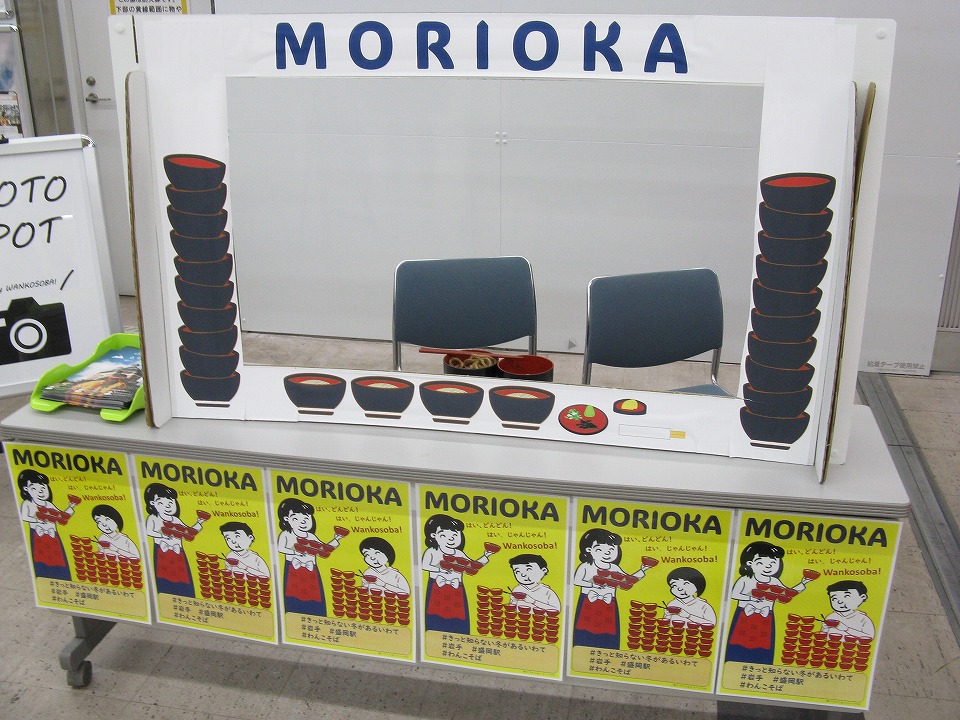 | 記念撮影用に、わんこそばを模したお椀とそばが用意してある。 工夫しているのは、そばがヒモなんだ(笑)。 |