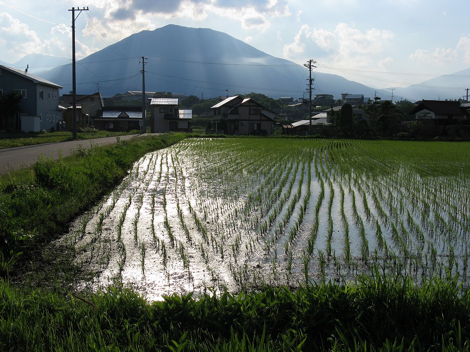 | スーパーの前の田んぼは稲が生長し始めていた。 バックの山は黒姫山(2053m)。 |