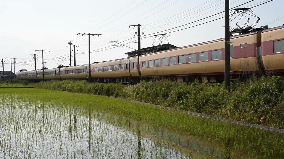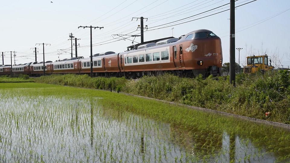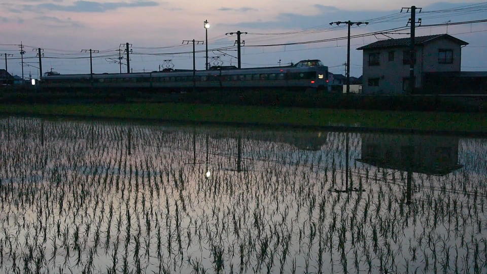 | まだ水が見える田んぼの横を「やくも22号」が通る。 273系のタイフォンの音色が確認できる約30秒の動画はこちら。 |