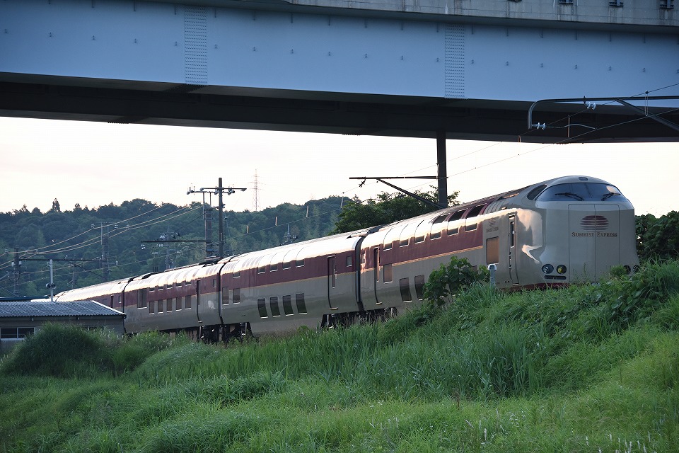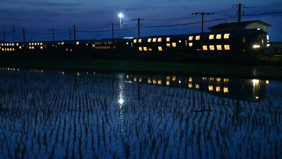 | この撮影ポイントでの〆は「サンライズ出雲」。 日没が1年で1番遅いこの時期なら、ほぼ20時の伯耆大山付近でも辛うじて明るみが残っている。 この日の日没時刻は19:24(最遅は2週間後の19:27)。 タイフォンの音色が確認できる約37秒の動画はこちら。 |