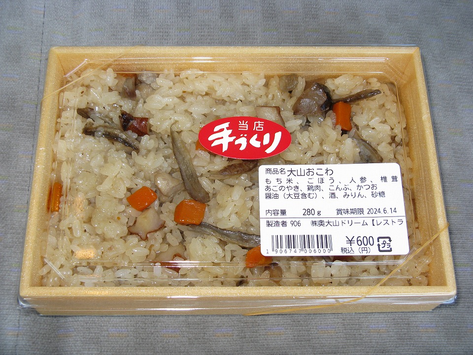 | 大山おこわ600円ナリで朝メシ。 添加物不使用で嬉しい。 田舎のおばあちゃんが作ってくれるようなやさしい味わい。 |