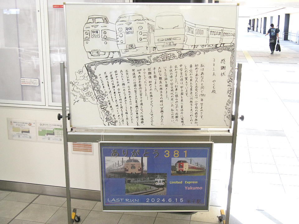 | 米子駅のホワイトボードには駅員さんが書いたという「感謝状」があった。 |