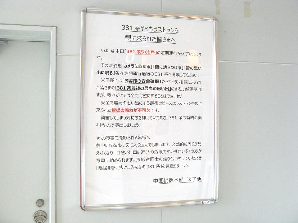 | 381系定期運行最終の「やくも1号」が終着駅出雲市に向かう。 沿線のあちこちに撮りテツや、手を降って見送ってくれる人がいる。 この電車は最初はスピーカーの真下の席を指定して10時打ちしてもらったのだが、 なんとその車両は団体で抑えられていたとのことで、やむなく「取れる席」で発券してもらった。 しかし幸いこの席もスピーカーの真下だったので、いい条件で録音ができた。 出雲市到着の案内がいったん終わった後に間を置いてからあった381系についての追加のアナウンスはこちら。 たまたま何となく録画していたので、アナウンスのアタマ切らすことがなくてよかったぁ。 アナウンス後は録画を停止させようと思っていたが、結局そのまま出雲市到着まで録画していたので 約05分15秒とちょっと長いです。 アナウンスの中の「また、長きにわたり…」の部分で、ちょっと間が空いた。車掌さんもグッときたんだと思われる。 ※381系は窓の下に「出っ張り」がないためカメラを固定するのが難しく、 水準器で水平をとれるにもかかわらず傾いてしまっています。 |