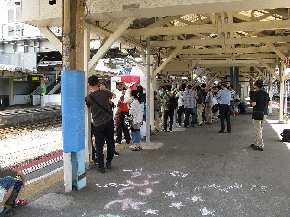 | 「やくも1号」が米子に到着した。 俺はわざと引いた位置でテツどもを入れて撮影した。 ちなみにホームにはチョークで「WEST EXPRESS 銀河」に関する落書き?があった。 |