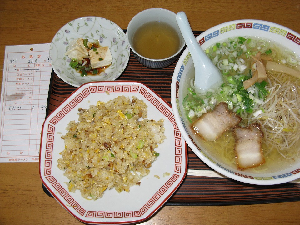 | 塩ラーメン半チャンセット900円ナリ。 悪かないんがけど、俺にはどちらもちょっとしょっぱかった。 なぜか、冷や奴が付いていた。 店内には、新幹線の各系の写真が数枚飾られていたが、店主がテツなのか? アピール度は特には高くなかった。 |