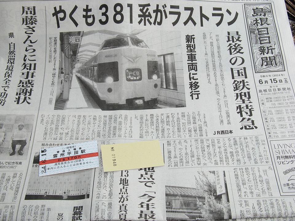 | たまには、と国道9号を逸れ、宍道湖の北側の国道431号を一畑電車と並走するように松江に向かう。 途中の雲州平田駅で半硬券の入場券をGETした。 島根日日新聞では、381系の記事が1面トップだ~。 |