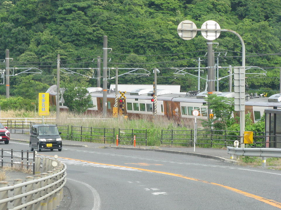 | この撮影ポイントでのメインにしていた国鉄色「やくも24号」だが、 大失敗! 通過時刻になっても電車が来ず、ちょっと離れたところで撮影していたアジア系のお兄ちゃんたちも、 仲間うちで「stopped」といいながらどこかに行っちゃった。 こりゃ、何かあったか? と思い、ネットで運行情報を確認したら、 伯備線内で落石のため「やくも26号」は運休となっていた。 それより前の24号については何も記載がなかったので、現在の列車位置情報をチェックしようとしていたら いきなり電車のタイフォンが! 慌てて外を見たら、遅れていた「やくも24号」じゃね~かよ! 急いでクルマから飛び出してカメラの動画スイッチを入れたがもちろん間に合わず…。 明らかにいつもより長くタイフォンを鳴らしていたので、運転士さんは三脚を立てていた俺を意識してくれたのかもしれない (タイフォンを鳴らすこと自体は俺に対するものではなく、第四種踏切の手前だから。)。 蒸し暑いもんだから、窓を閉めてエアコンのファンを最大の風量にしていたので 第四種踏切の手前にある第一種踏切の鳴動が聞こえなかったのだ。 あ~、もったいない。最近にない大失敗だ。緊張を緩めたのがいけなかった。 ということで、UPする価値はないが自分への戒めを込めた約10秒の動画はこちら。 |