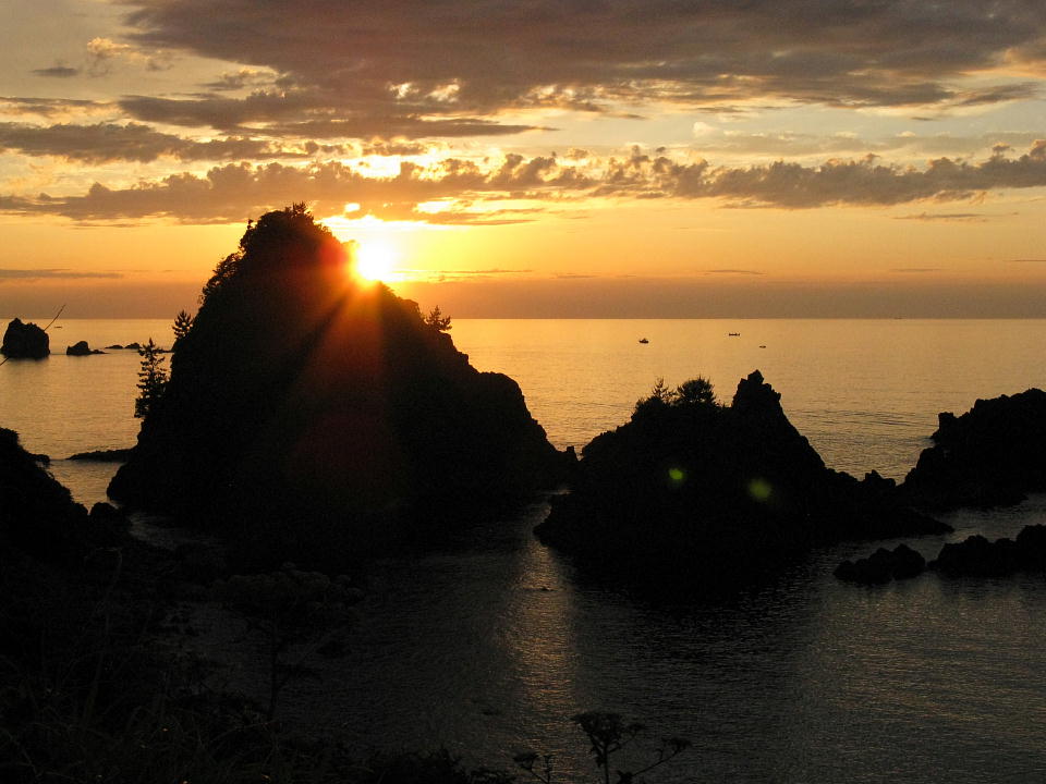 | 米子から山陰道で鳥取市、そこから国道9号と山陰近畿道で居組に来た。 ちょうどそこで日の入りを迎えたので、穴見海岸でちょっと撮影。 |