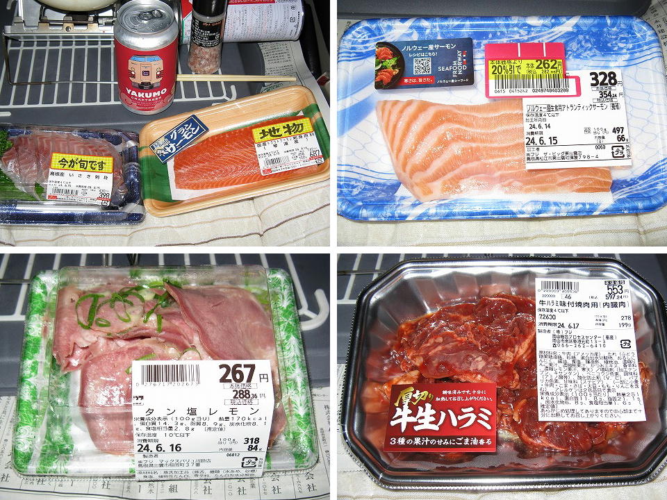 | 刺身は結局イサキだけ堪能し、サーモンは自宅での楽しみに取っておくことにした。 刺身のあとは豚タンと牛ハラミで焼き肉大会! |