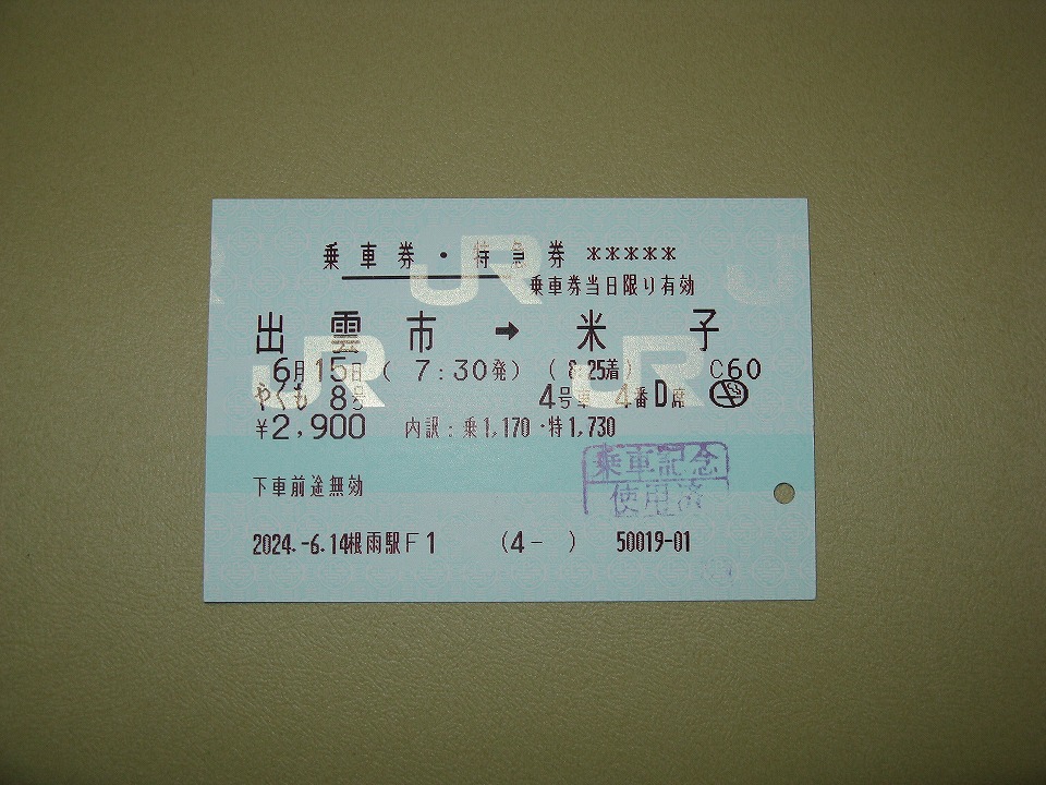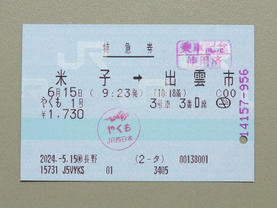 | 昨日、根雨駅発売してもらった「やくも8号」のきっぷ。 山陰エリアでは、乗車記念にきっぷをくれると分かっているので、 乗車券と併せた券にしてもらった。 |