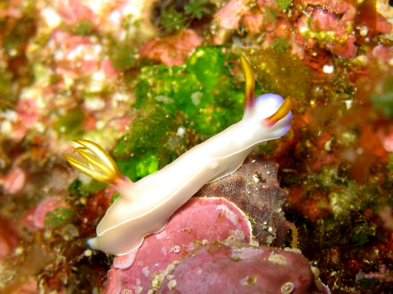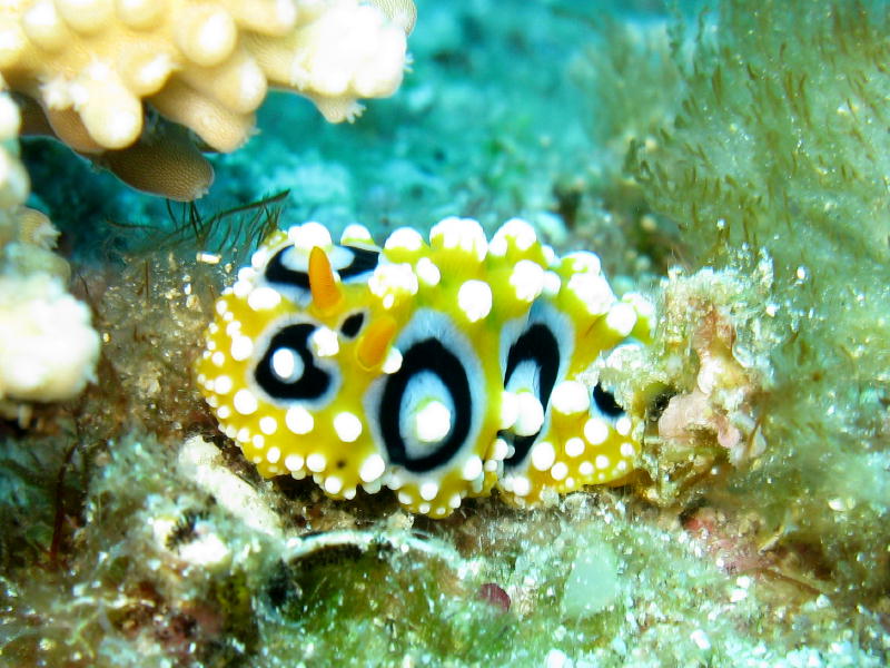 | サンゴに上にはキイロイボウミウシ(殻を持たない貝の仲間。)。 触角(ツノみたいなの。)がある方が前なので、 コイツはこっち向き。 |