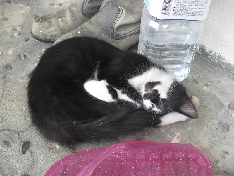 | 店の入口横でひっくり返って寝ている「クロ」。 |
