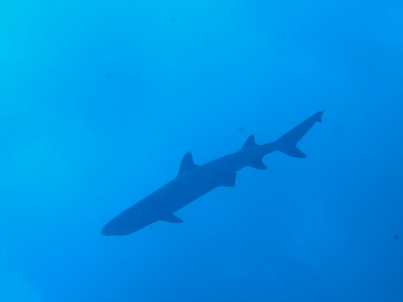 | ホワイトチップ(ネムリブカ)も眠らずに泳いでいた。 背びれと尾びれの先が白いのが分かるかな。 台風の後は、水温が一気に4℃ほども下がった。 |