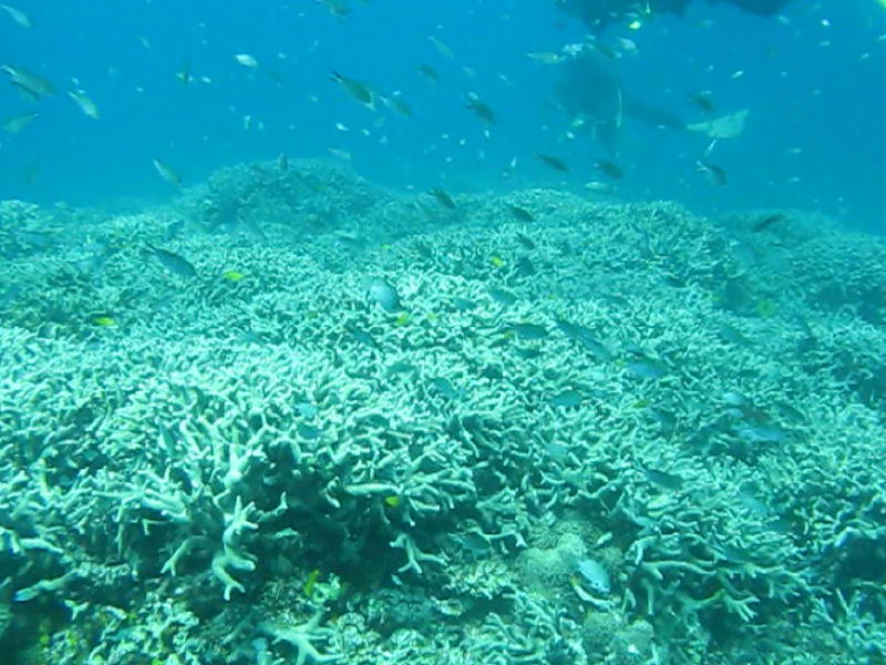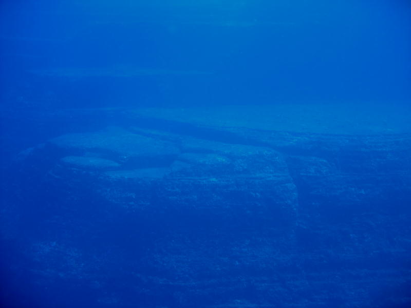 | 台風は抜けて、ダイビングは問題なくできた。 飛行機も問題なく飛んだ。 北風(翌日の気象庁の記録では西風。)になったお陰で、 島の南側の「海底遺跡」に行くことができた。 写真は「メインテラス」を反対側から見たものだけど、 台風が海水をかき混ぜたため透視度が低く、 ちょっと見ただけでは何が何だか分かんないかもね。 |