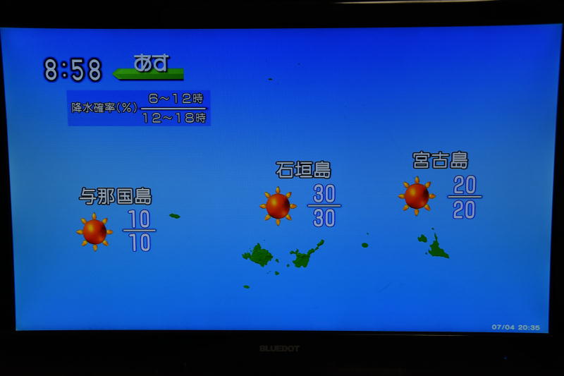 | 2017/07/03 3時現在、台風3号が石垣島付近を通過中。 石垣島地方に暴風・波浪警報が出ているが、与那国島地方には出ていない。 台風は、天気図では暴風域は、ない。 外に出てみたら、風が少しあり、 星が見えるものの、雨がどこかから飛んで来ている、といった具合。 今日、与那国島を発つ予定の人たちは、飛行機が飛ぶのかどうかヤキモキしている。 今日、与那国島で潜る予定の人たちは、ダイビングできるかどうかヤキモキしている。 5時半頃になって、石垣島地方の暴風警報は解除されたが、波浪警報は引き続き出ている。 与那国島地方は波浪注意報。 |