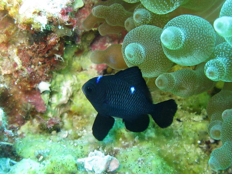| ソーミンチャンプルーのお昼をいただいたら、 与那国島でのラストダイブ。 砂地やドロップオフ(崖)などが楽しめるポイント。 これはミツボシリュウキュウスズメダイの子供。2cmぐらい。 |
