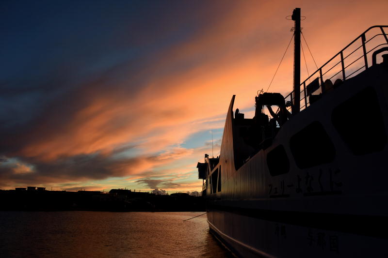 | 6時にふっと目を覚ましたら、窓の外にきれいな朝焼けが見えた。 慌ててデジイチを持ち出し、港まで走って行って撮影した。 朝から走るとは思わなかった…。腰が痛い…。 今日は石垣島〜竹富島へ移動するが、飛行機をキャンセルして この「フェリーよなくに」に乗ることにした。 俺が事前に調べたところでは、昨日の出港だったはずだが、 どうやら火曜日の石垣発を与那国発と見間違っていたようだった。やれやれ。 |