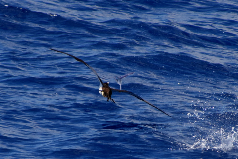 | フェリーを止まり木にしているカツオドリが、 トビウオが飛ぶと捕まえに行く。 このトビウオは、辛くも餌食にならずに済んだ。 |