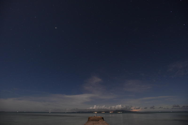 | 明るいように写っているが、実際は月明かりだけ。 お月様は明るいんだね。 正面の島は西表島。 流れ星でも写ればなと相当な枚数を撮ったが成果なし。 ISO1000 f4 10秒 |
