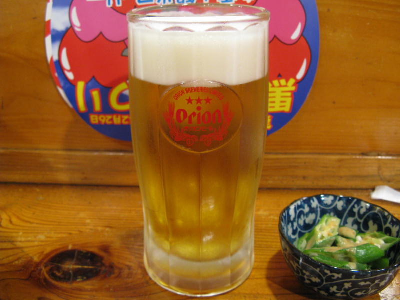 | ガマンにガマンをして、18時を過ぎたらいつもの「南ぬ島(ぱいぬしま)」に呑みに行く。 ところが、最近は人気が出てきてカウンターでも入れないことが多く、 結局覗くこと5回目にして、やっと入れた。 嬉しいことに、店の人は俺を憶えていてくれているので、「すみませんねぇ」と言ってくれるのが嬉しい。 まずは何より、オリオンの生でくゎんぱ〜い。 |