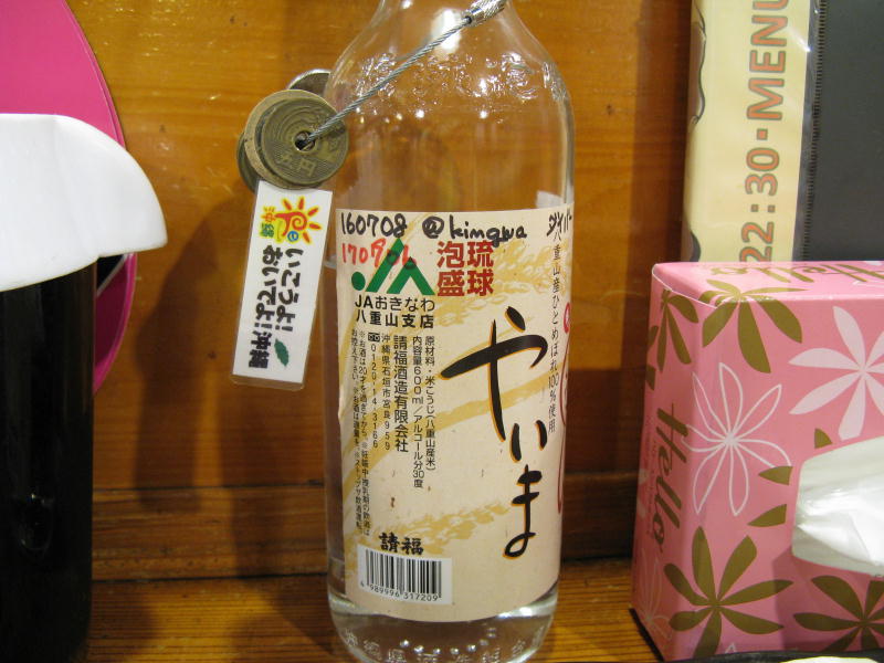 | オリオンの生を空けたら、次は「しまー」(=泡盛)ですね。 ここはボトルキープしてあるんだよん。 前回から1年空いても、置いておいてくれるのだ。 |