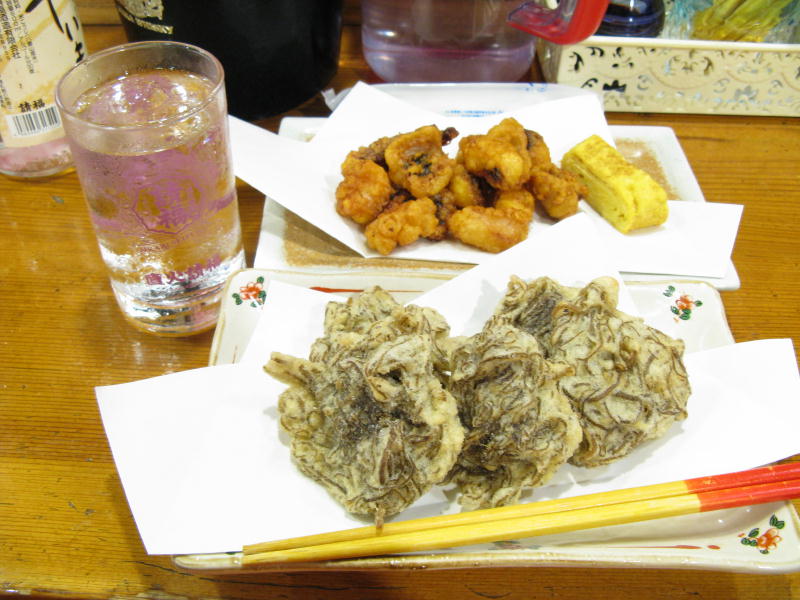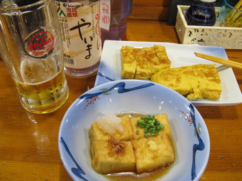 | アフターダイブは、昨日と同じ「南ぬ島」でうだうだと。 ピリ辛卵焼きと、島豆腐の揚げ出し。 どっちも、でーじまーさんどー(とても旨いよー)。 |