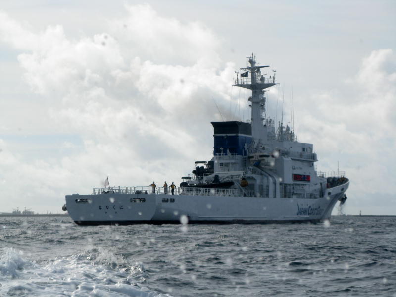| 尖閣諸島関係からか、石垣港には海上保安庁の巡視船がいつもにも増して停泊していた。 写真は、「よなくに」。フェリーと同じでやはり「ぐ」ではなく「く」だ。 後方甲板はヘリが着艦できる仕様だ。 |