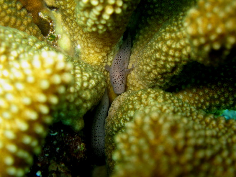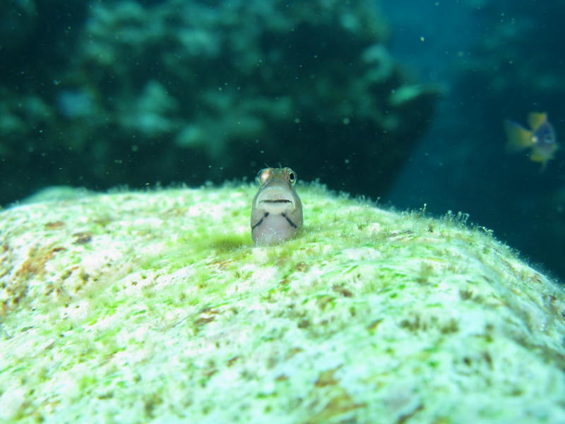 | サンゴの穴からぴょこんと顔を出したイシガキカエルウオ。 も〜俺は、この1本は、この1匹で充分だな〜(笑)。 ずっと写真を撮り続けていたい〜〜〜。 |