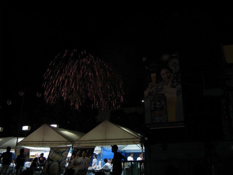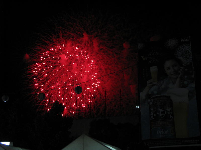 | 〆は花火。 オリオンの看板と一緒に撮ろうともくろんでいたら、 照明を消されてしまった。 |