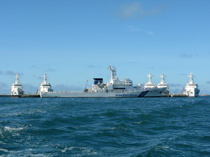 | さあ、ダイビングの最終日。 気持ちよく晴れた。 石垣港には、今日もたくさんの海保の巡視船が停泊している。 |