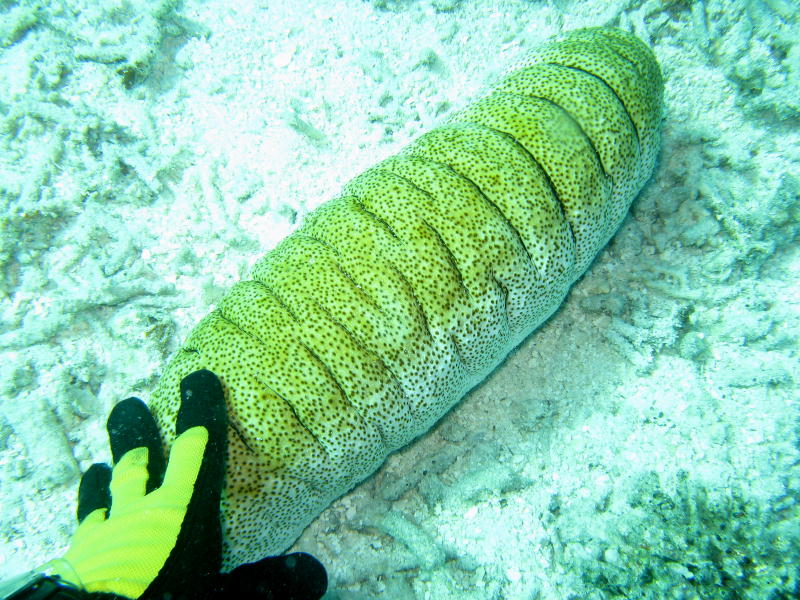 | 1本目を開始してすぐにいたナマコ。 フランスパンみたいでしょ。 大きさが分かるように俺の左手を添えている。 コイツを持ち上げたりひっくり返して寄生しているエビを探したりして、こねくり回す。 |