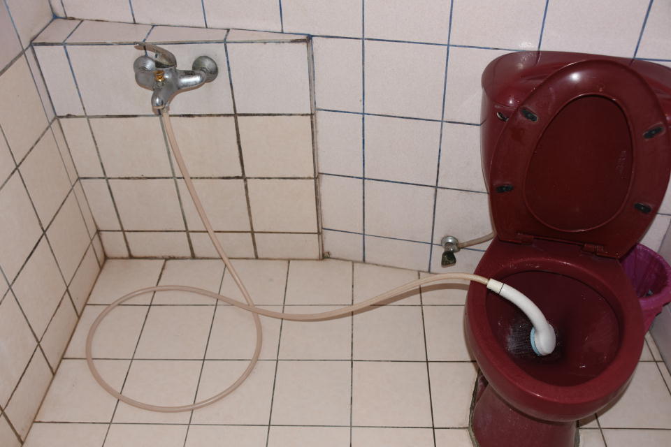 | シャワーを浴びようとしたが、ちゃんとした(?)ホテルのようにすぐお湯が出てくるわけではなかった。 そういうときはしばらく出しっ放しにしながら、他のことをしているしかない。 お湯ではないものがバスルームを濡らすと冷たいだけなので、 お湯が出るようになるまでの数分間はトイレに流す。 |