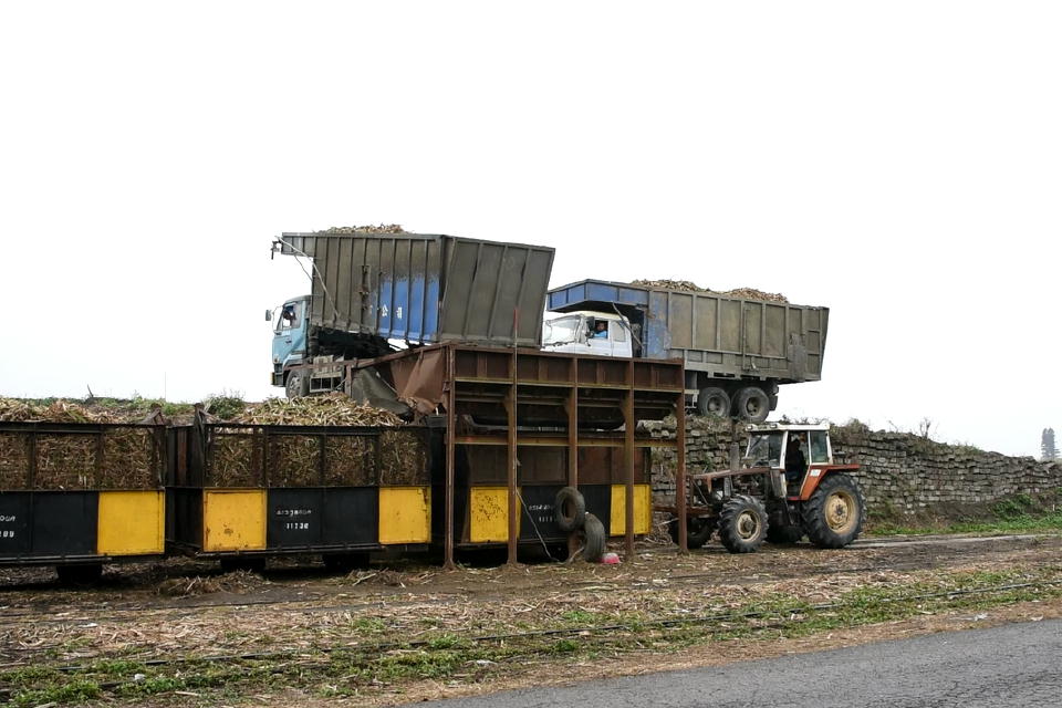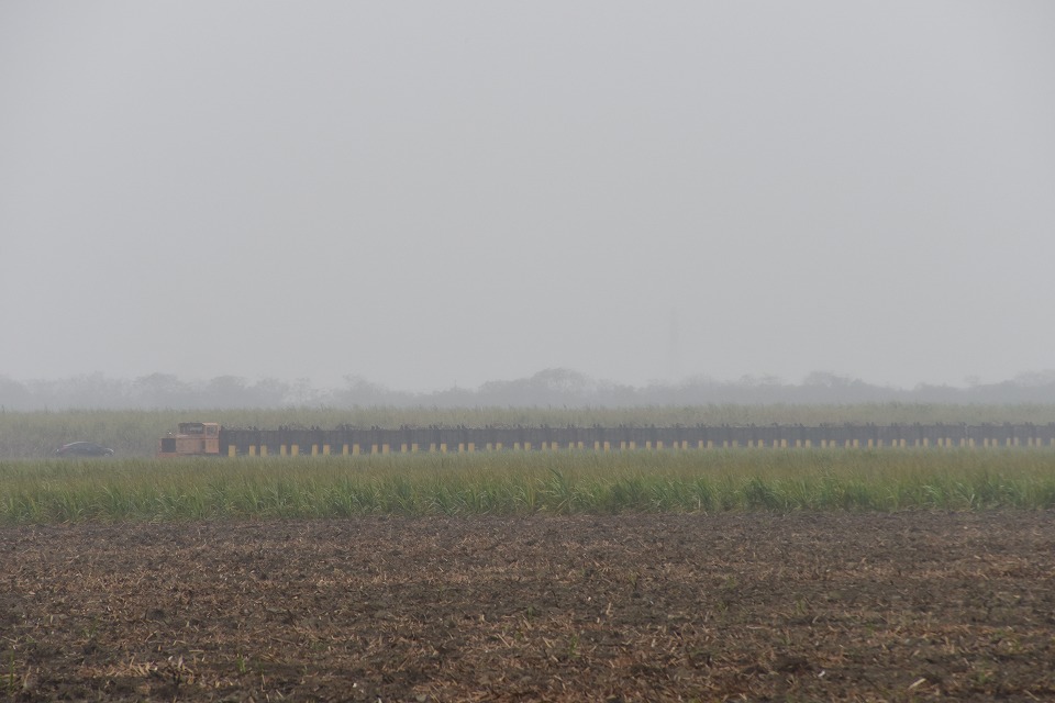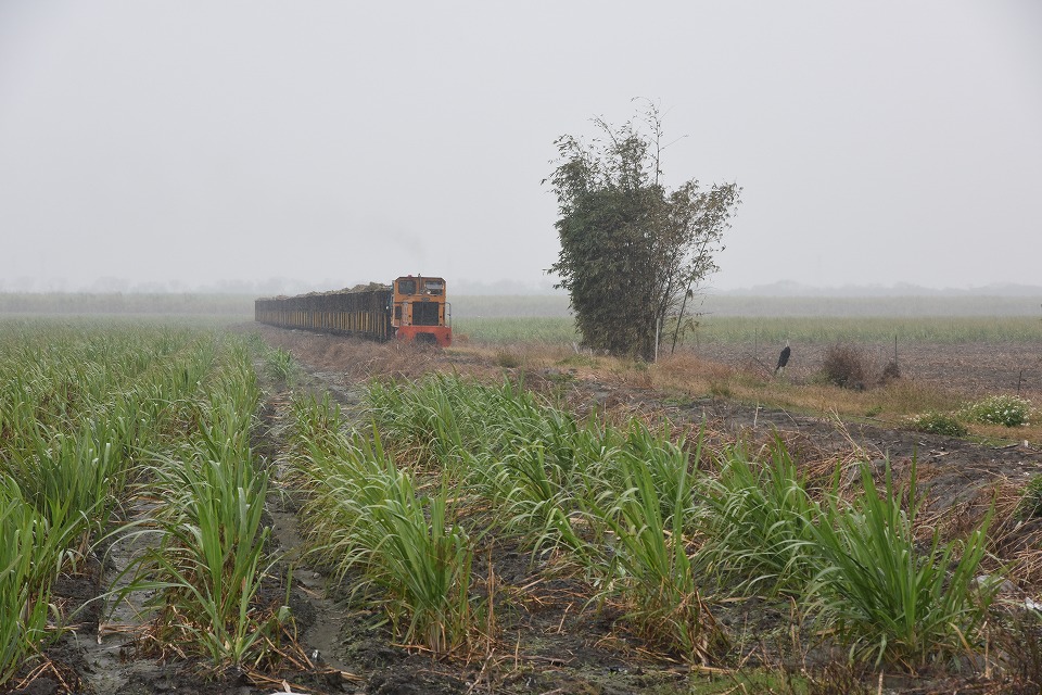 | 雨がしっかり降ってきた中、 サトウキビを積んだ工場向けの列車がやってきた。 傘を持ちながらの不安定な状況で撮影。 |