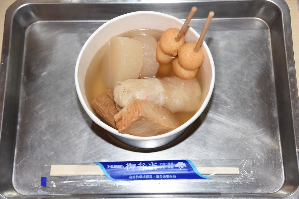 | 呑んでたらハラが減ってきたので、すぐ近くのイレブン屋でおでんを買ってきた。 |