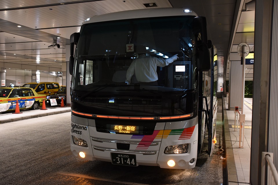 | 定刻にバスタ新宿に着いたが、このバスの運転手が下手クソで、 珍しく酔っちまった。変速時のクラッチ操作がなっちゃいないんだね。 特にシフトダウン時の車体の揺れの大きさが、運転手本人は分かっているんだろうか。 あ、このバスはアルピコだけど練馬ナンバーだね。 |